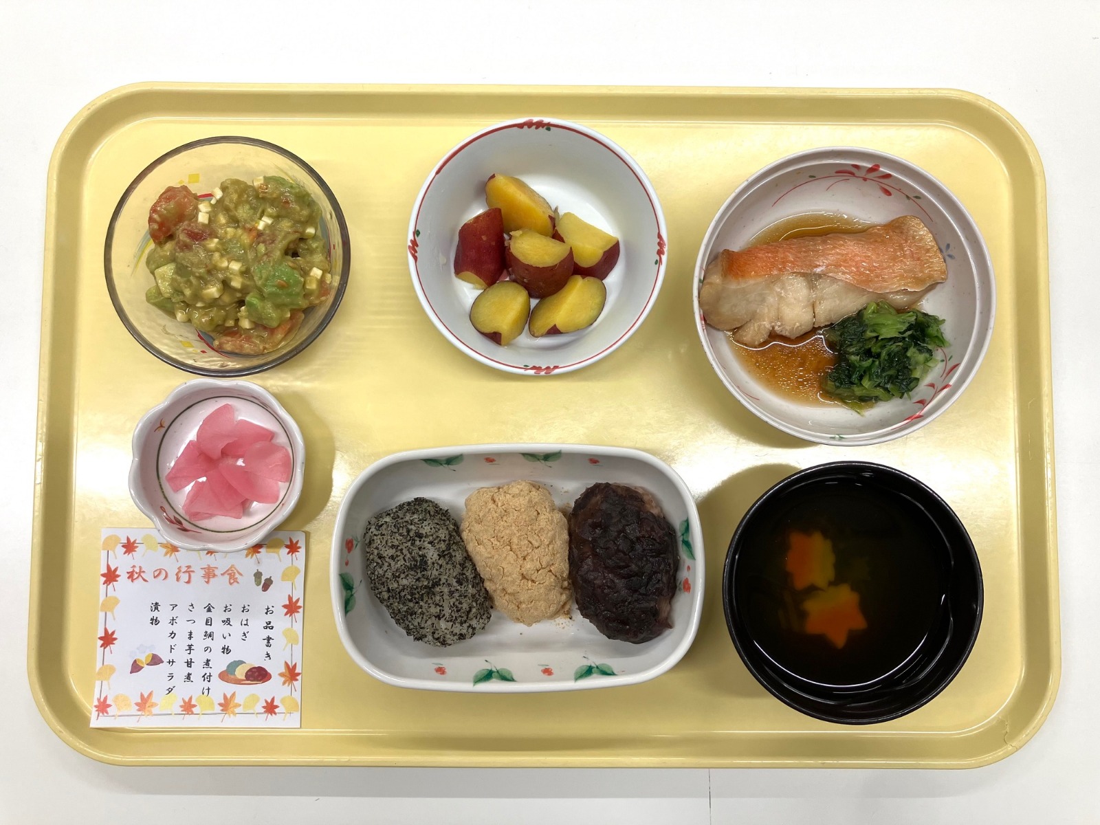 本日の献立は、おはぎ(ごま、きなこ、あんこ)、お吸い物、金目鯛の煮付け、さつま芋甘煮、アボカドサラダ、漬物と、秋の味覚をたっぷり取り入れた献立で、見た目にも彩り豊かな内容となっています。